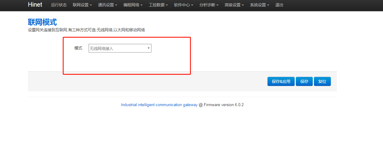 1. 网关后台联网模式是否正确,进网关后台,点击“联网设置 - 联网模式”,修改模式为“无线网络接入”,再点击【保存应用】,重启网关生效。