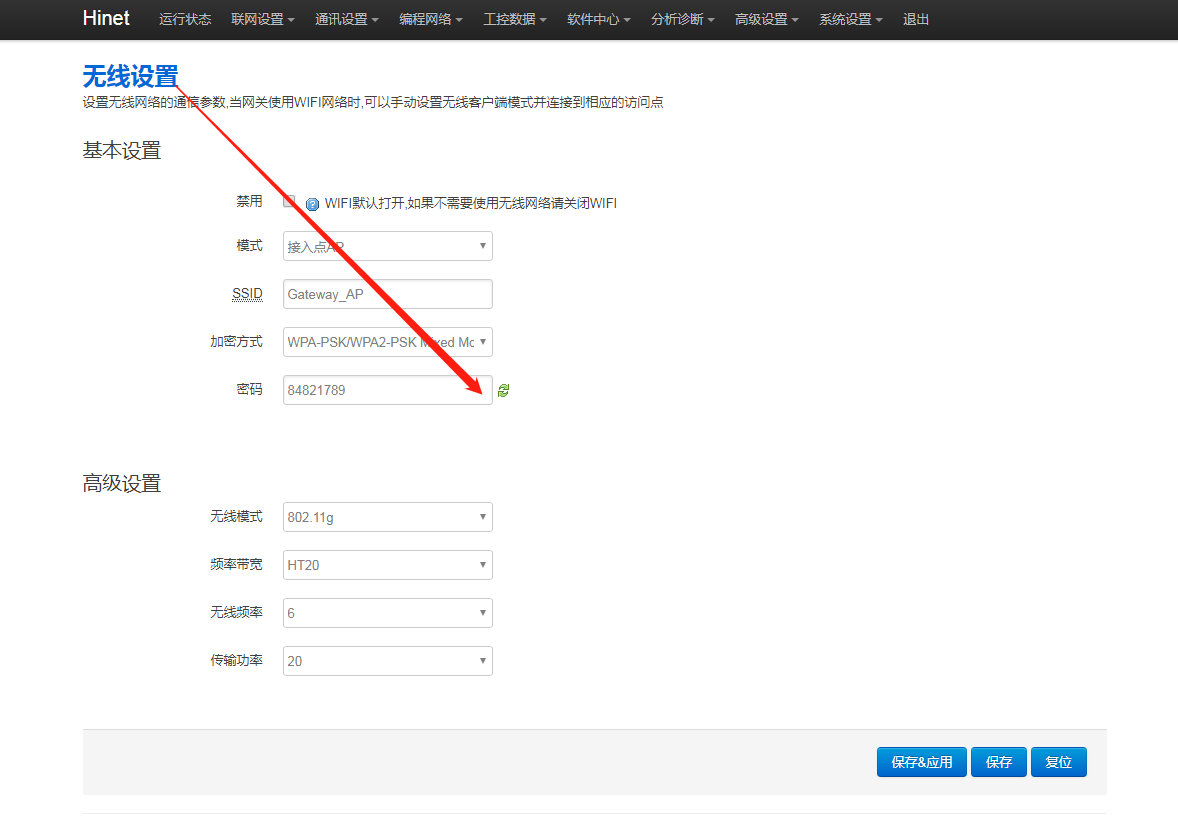 2.WIFI密码是否正确,进网关后台,点击“通讯设置 - 无线设置”,点击显示密码图标,确认密码。