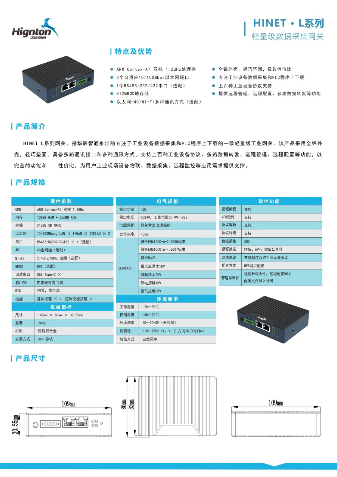 HINET L系列网关,是Ezpay官网智通推出的专注于工业设备数据采集和PLC程序上下载的一款轻量级工业网关。该产品采用全铝外 壳,轻巧坚固,具备多路通讯接口和多种通讯方式,支持上百种工业设备协议、多路数据转发、远程管理、远程配置等功能,以 完善的功能和性价比,为用户工业现场设备物联、数据采集、远程监控等应用需求给予支撑。